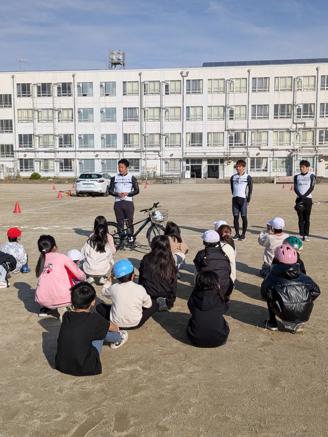 2つのパートに分かれ、伊藤が担当するAグループでは自転車の点検方法と、運動場に設営した特設コースを児童たちと回り、歩道の走り方・横断歩道の渡り方・一時停止・右折と左折・路上駐車をしている車の避け方などを指導させていただきました。